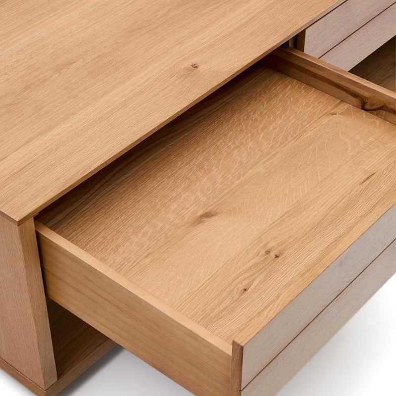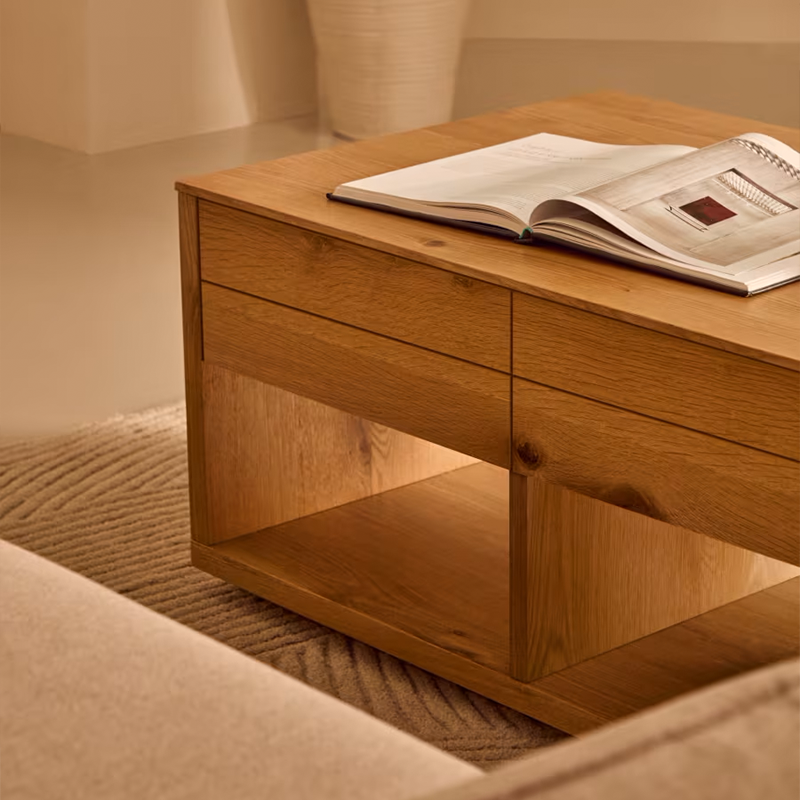 La mesa de centro Alguema destaca por su diseño funcional y líneas limpias, pensada para espacios contemporáneos. Fabricada en chapa de roble con acabado natural, aporta calidez y una estética orgánica al ambiente. Sus dos cajones integrados ofrecen una solución de almacenaje práctica sin renunciar al diseño. Con unas dimensiones de 140 x 60 cm, es una pieza equilibrada que combina estilo, orden y funcionalidad.