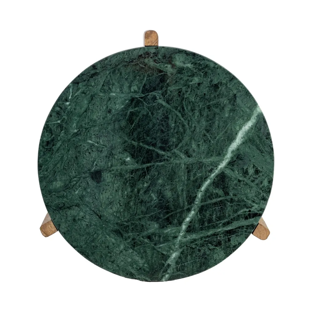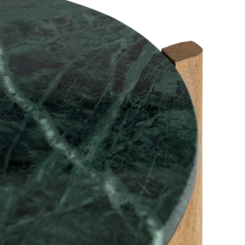 Mesa de centro Green 46, de tres patas en madera con un diseño orgánico y equilibrado. El sobre de mármol verde aporta sofisticación y un acento natural distintivo. La combinación de materiales crea un contraste elegante y atemporal. Una pieza decorativa que eleva el espacio con estilo y personalidad.