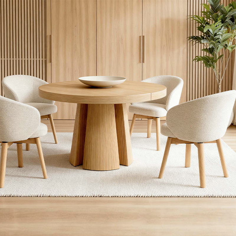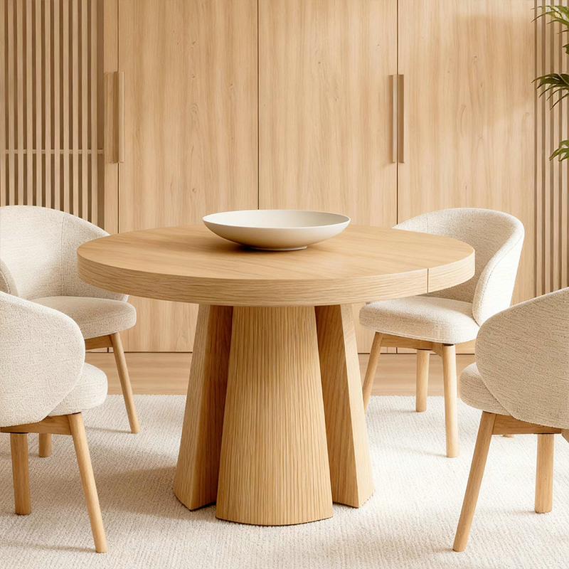 La mesa MARCEL es una joya del diseño contemporáneo que combina calidez, funcionalidad y una silueta sorprendente. Fabricada en chapa madera de roble natural, su superficie redonda de 120 cm, extensible hasta 170 cm, se despliega desde el centro con fluidez para adaptarse a encuentros íntimos o reuniones más amplias, convirtiéndola en una pieza tan versátil como elegante.